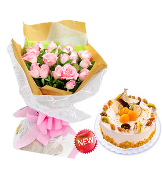 • 21枝粉玫瑰,搭配綠葉+8寸水果奶油蛋糕